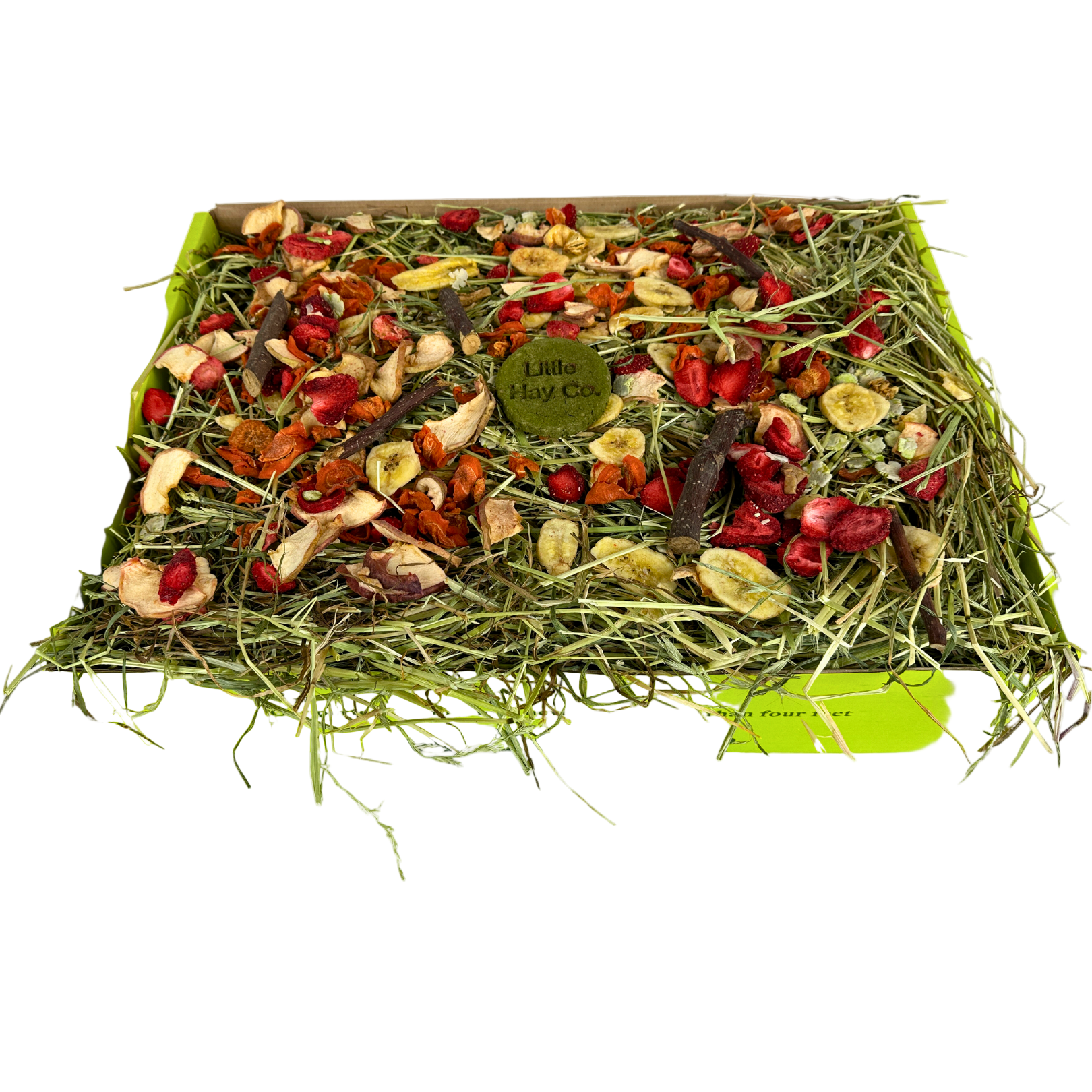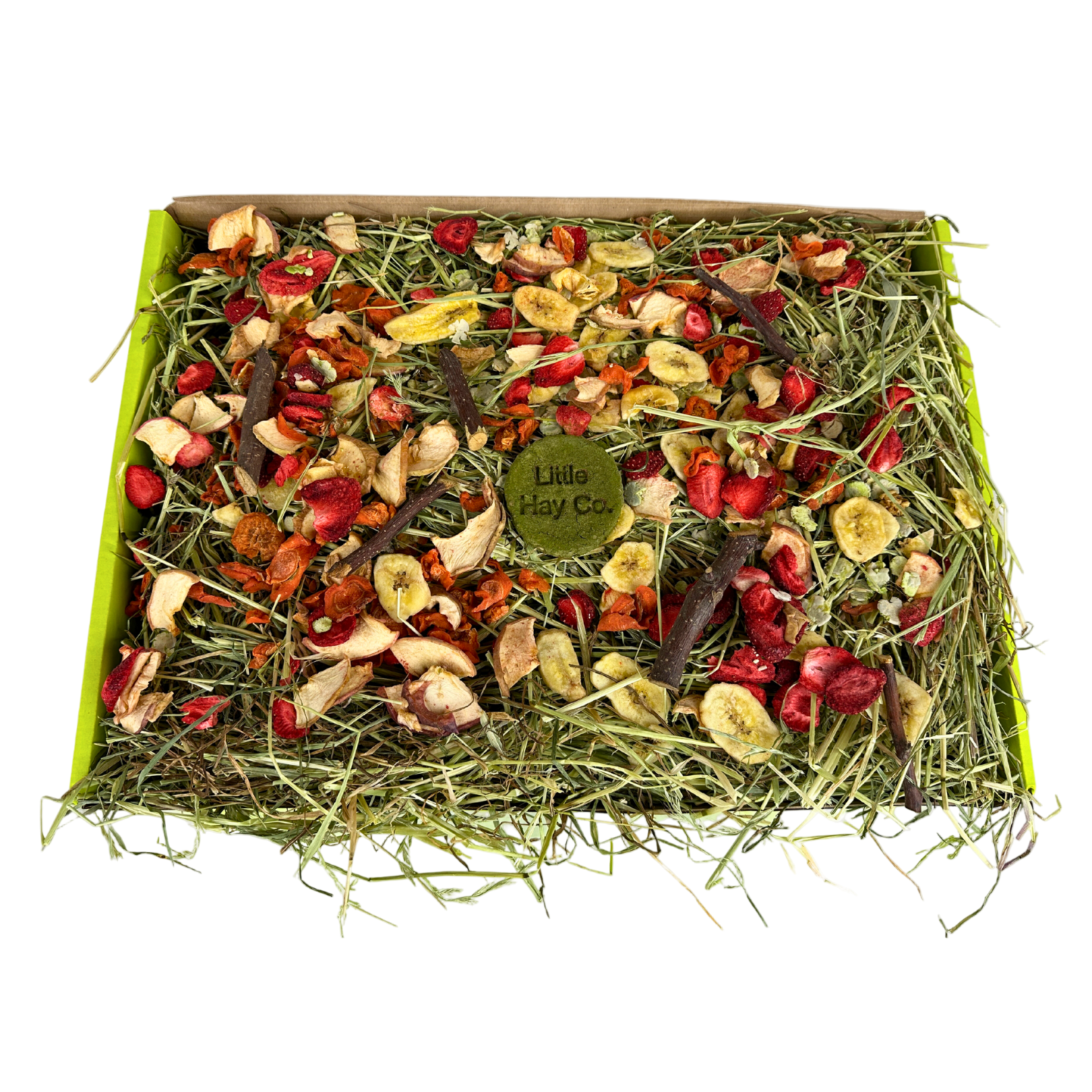Ingredients: Hay of choice, Banana chips, Apple, Carrot and Strawberry slices and flaked peas. Finished with applewood sticks and Chewy Chews UK spinach based Little Hay Co Cookies.
