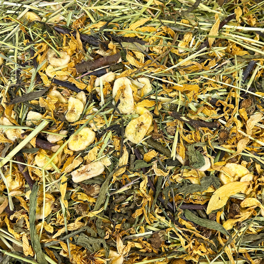 Ingredients: Sunflower leaves, Marigolds, pear sticks, plantain leaves, grass pellets, banana chips and a Chewy Chews Little Hay Co Cookie*