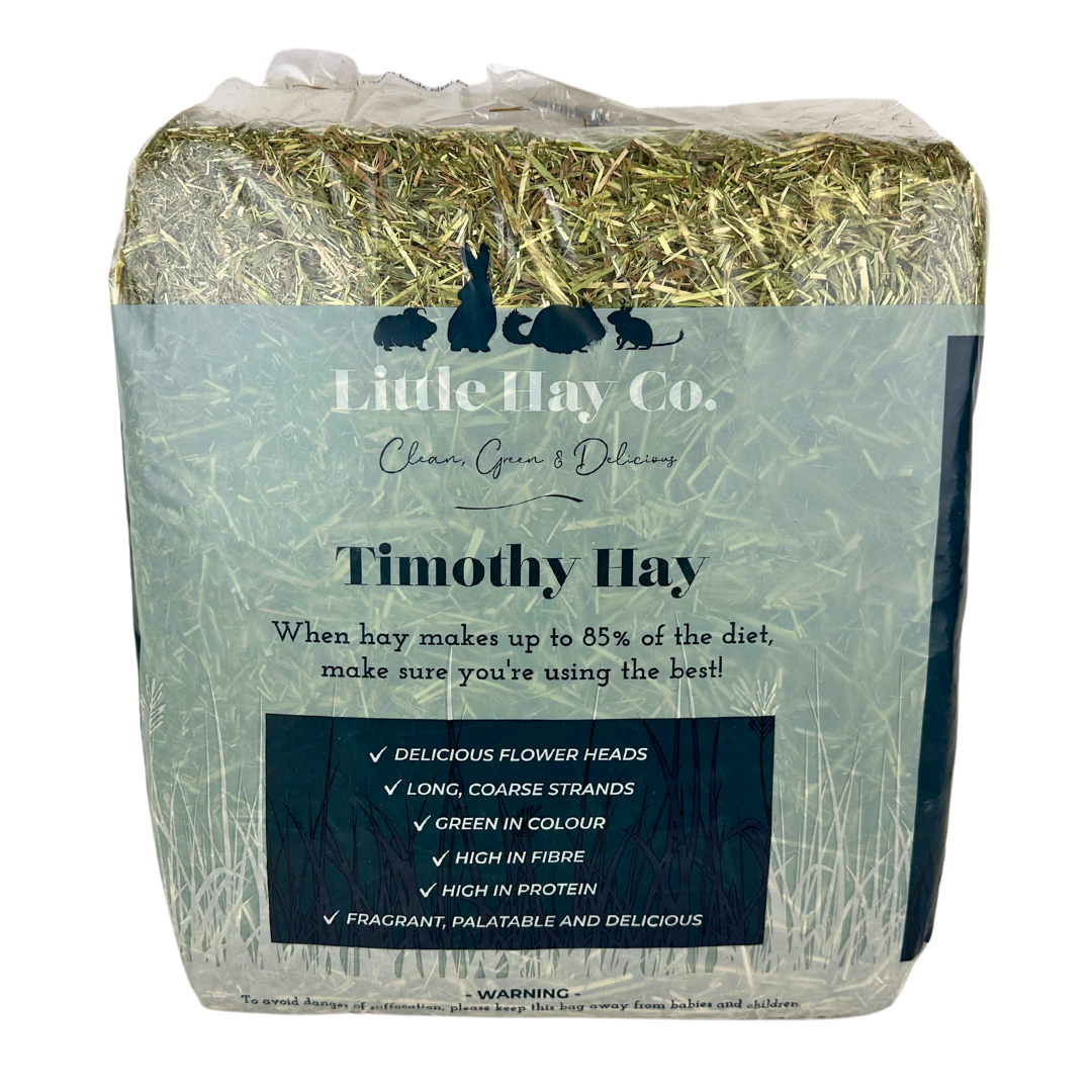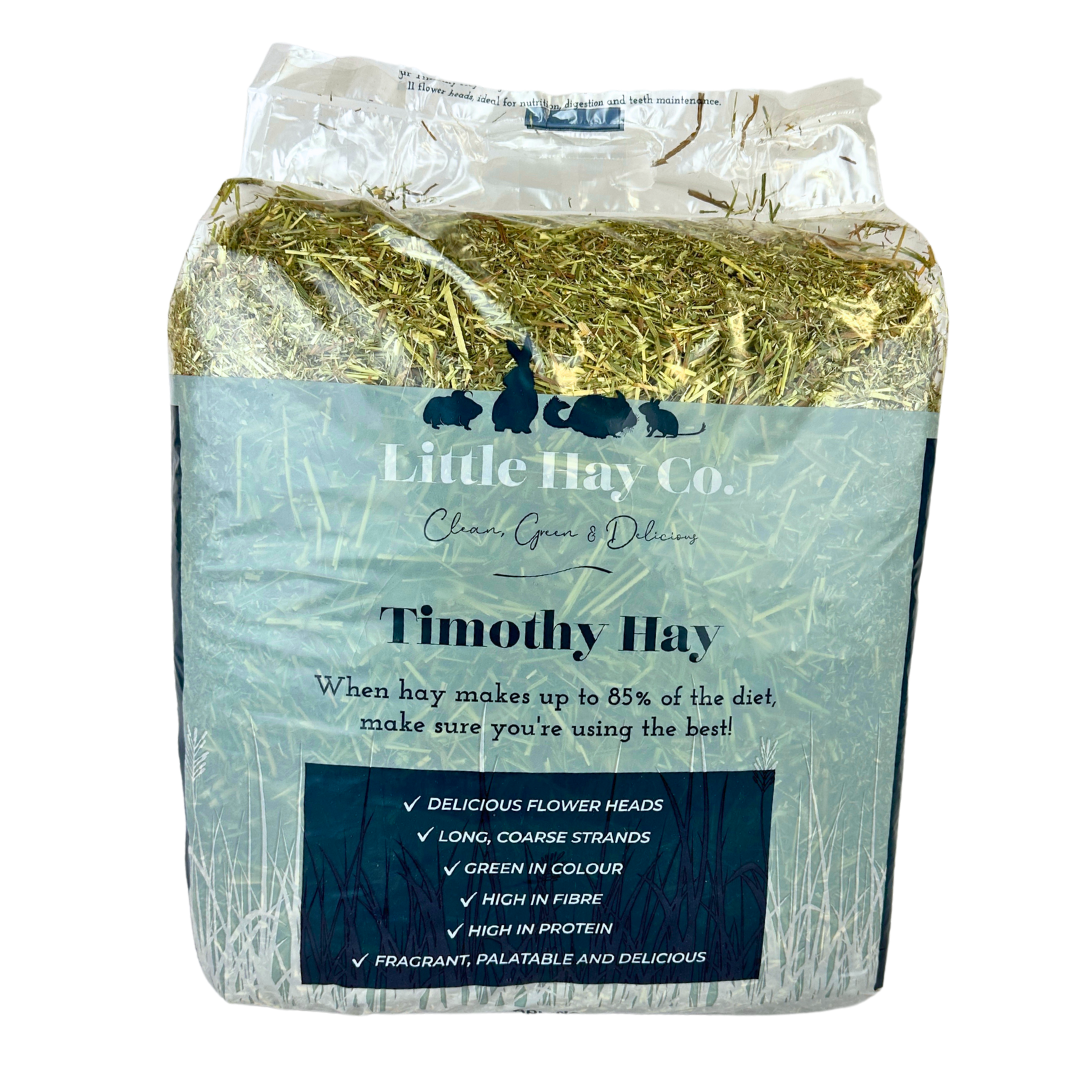 Our Timothy Hay is high in fibre. The classic cut is long in the strand and has fuller rougher flowery heads, ideal for digestion and teeth maintenance in your pet. Our timothy hay is less fattening, making it a premium choice for your pet.